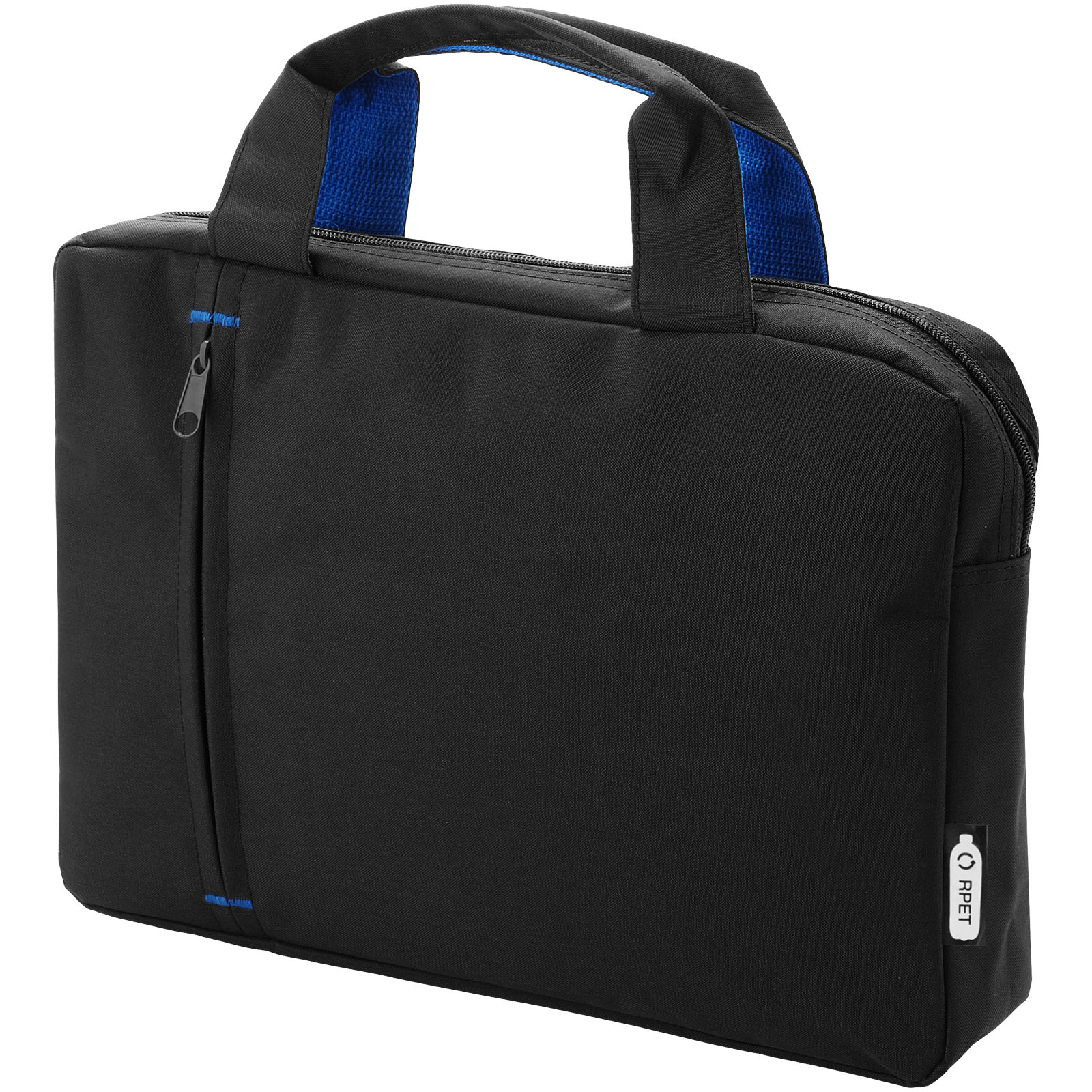 Konferenztasche aus recyceltem PET Kunststoff mit einem Hauptfach mit Reißverschluss und einer Reißverschlusstasche auf der Vorderseite, mit verstärkten Tragegriffen an der Oberseite und trendigen farblichen Kontrastelementen.